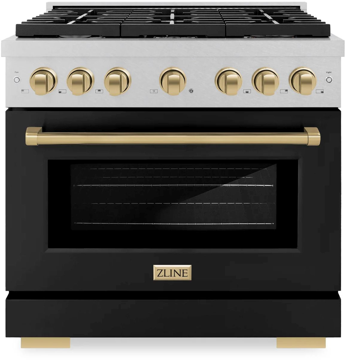 The ZLINE Autograph Edition 36 in. 5.2 cu. ft. Paramount Dual Fuel Range with 6 Burner Gas Cooktop and Electric Convection Oven in Satin Stainless Steel with Black Matte Door and Champagne Bronze Accents (SDRSZ-BLM-36-CB) combines the versatility of a gas cooktop with 6 Italian-made auto-reignition burners, an electric convection oven with digital thermostat technology, enhanced cast iron grates, a beautiful black matte door with a Horizon window design, and elegant champagne bronze knobs and handle allowing you to master every meal.