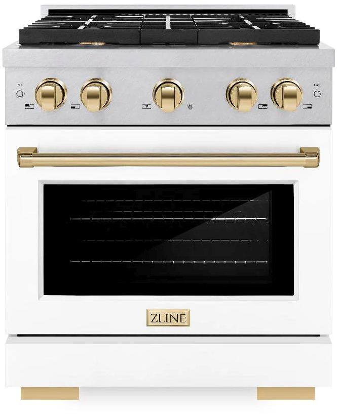 The ZLINE Autograph Edition 30 in. 4.2 cu. ft. Paramount Dual Fuel Range with 4 Burner Gas Cooktop and Electric Convection Oven in Satin Stainless Steel with White Matte Door and Polished Gold Accents (SDRSZ-WM-30-G) combines the versatility of a gas cooktop with 4 Italian-made auto-reignition burners, an electric convection oven with digital thermostat technology, enhanced cast iron grates, a beautiful white matte door with a Horizon window design, and elegant polished gold knobs and handle allowing you to master every meal.