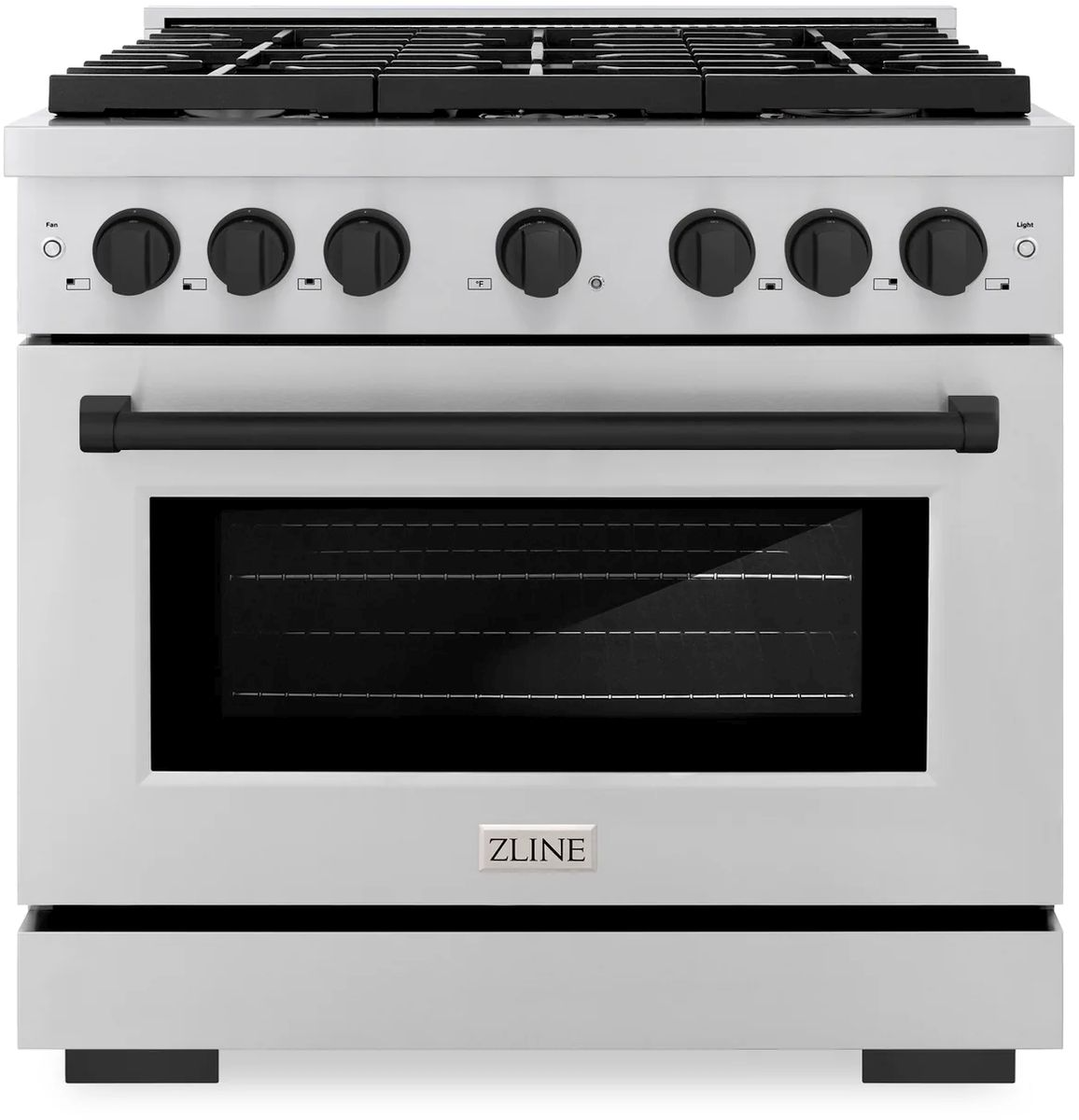 The ZLINE Autograph Edition 36 in. 5.2 cu. ft. Paramount Dual Fuel Range with 6 Burner Gas Cooktop and Electric Convection Oven in Stainless Steel with Matte Black Accents (SDRZ-36-MB) combines combines the versatility of a gas cooktop with 6 Italian-made auto-reignition burners, an electric convection oven with digital thermostat technology, enhanced cast iron grates, a Horizon oven door window design, and elegant matte black knobs and handle allowing you to master every meal.