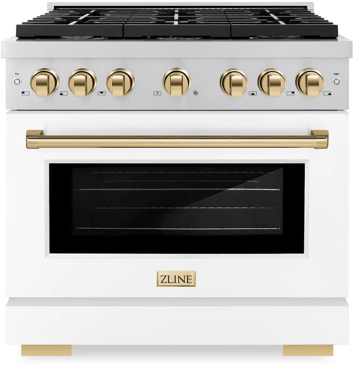 The ZLINE Autograph Edition 36 in. 5.2 cu. ft. Paramount Dual Fuel Range with 6 Burner Gas Cooktop and Electric Convection Oven in Stainless Steel with White Matte Door and Polished Gold Accents (SDRZ-WM-36-G) combines the versatility of a gas cooktop with 6 Italian-made auto-reignition burners, an electric convection oven with digital thermostat technology, enhanced cast iron grates, a beautiful white matte door with a Horizon window design, and elegant polished gold knobs and handle allowing you to master every meal.