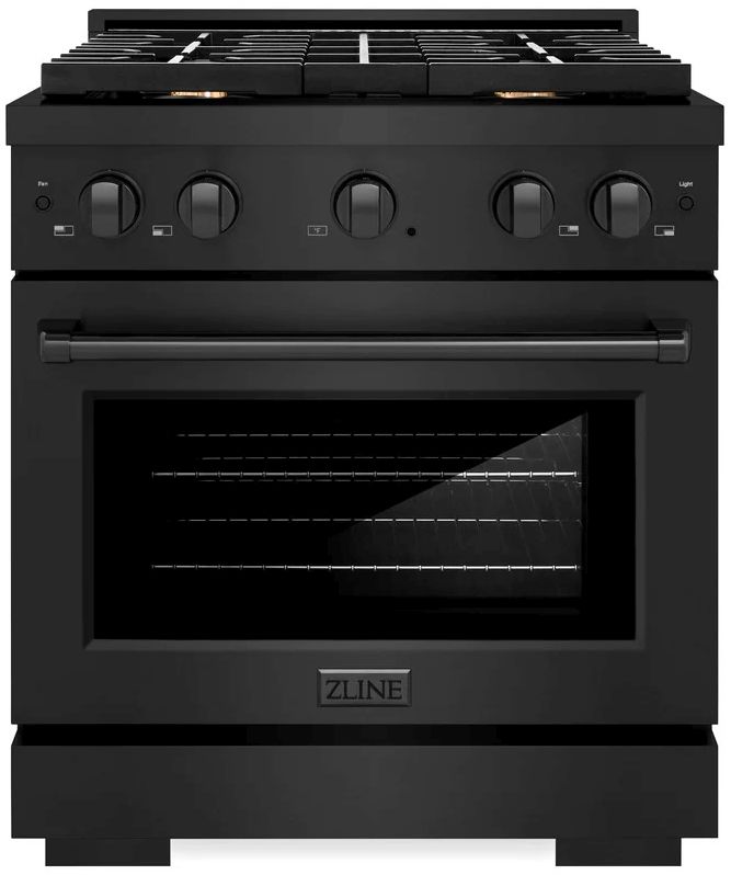 The ZLINE 30 in. 4.2 cu. ft. Paramount Dual Fuel Range with Gas Cooktop and Electric Convection Oven in Black Stainless Steel with 4 Brass Burners (SDRB-BR-30) combines the versatility of a gas cooktop with 4 Italian-made brass auto-reignition burners, an electric convection oven with digital thermostat technology, enhanced cast iron grates, and a Horizon oven door window design allowing you to master every meal.