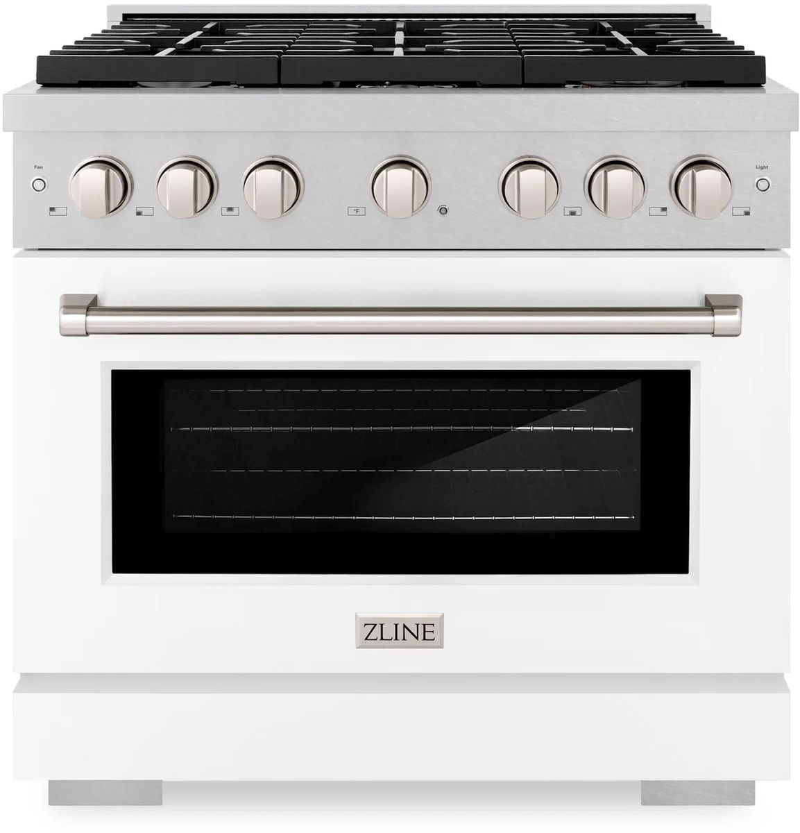 he ZLINE 36 in. 5.2 cu. ft. Paramount Dual Fuel Range with 6 Burner Gas Cooktop and Electric Convection Oven in Satin Stainless Steel with White Matte Door (SDRS-WM-36) combines the versatility of a gas cooktop with 6 Italian-made auto-reignition burners, an electric convection oven with digital thermostat technology, enhanced cast iron grates, and a beautiful white matte door with a Horizon window design allowing you to master every meal.