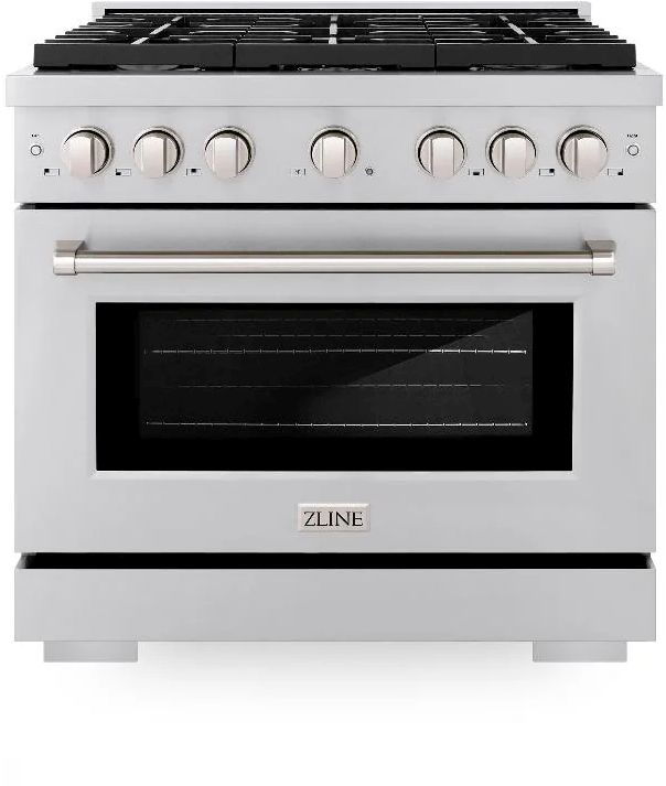The ZLINE 36 in. 5.2 cu. ft. Paramount Dual Fuel Range with 6 Burner Gas Cooktop and Electric Convection Oven in Stainless Steel (SDR36) combines the versatility of a gas cooktop with 6 Italian-made auto-reignition burners, an electric convection oven with digital thermostat technology, enhanced cast iron grates, and a Horizon oven door window design allowing you to master every meal.
